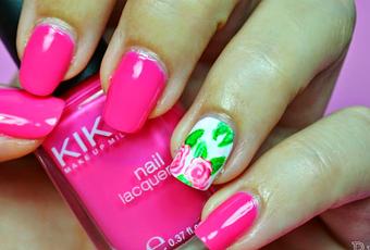 Si no tenéis pintura acrílica, podéis mezclar los esmaltes rosa y blanco para conseguir el tono rosa pastel, hacer los pliegues de las rosas con el esmalte rosa sin mezclar y con un esmalte verde dibujar las hojas tal y como os enseño en el tutorial de Spring Flowers.