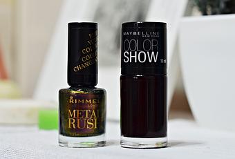 - Burgundy Kiss de Color Show (Maybelline New York), un bordó intenso que dependiendo de la luz puede aparentar ser negro, es de una duración considerablemente buena pero requiere 3 capas de producto para lograr el color del envase.