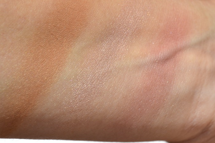 El trío está compuesto de un bronzer satinado en tono medio, ideal para pieles claras, un iluminador rosa claro-champagne absolutamente precioso, me encanta como queda, se funde en la piel perfectamente y un colorete bastante pigmentado rosa satinado con levísimo brillo muy favorecedor .