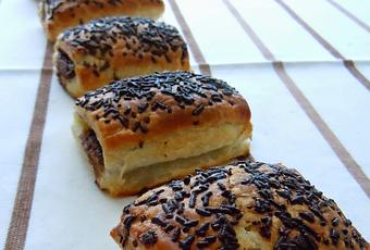- Sobre cada porción de rectángulo y con ayuda de una cuchara o cuchillo extendemos una generosa porción de nocilla por el lado más estrecho y cerramos con cuidado formando pequeñas napolitanas.