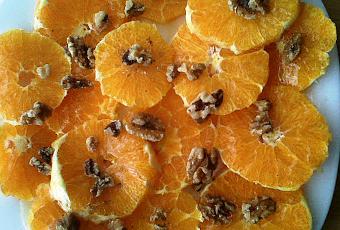 Cortar las naranjas a rodajas no demasiado finas, esparcer la cucharada de miel por encima y añadir la nueces.