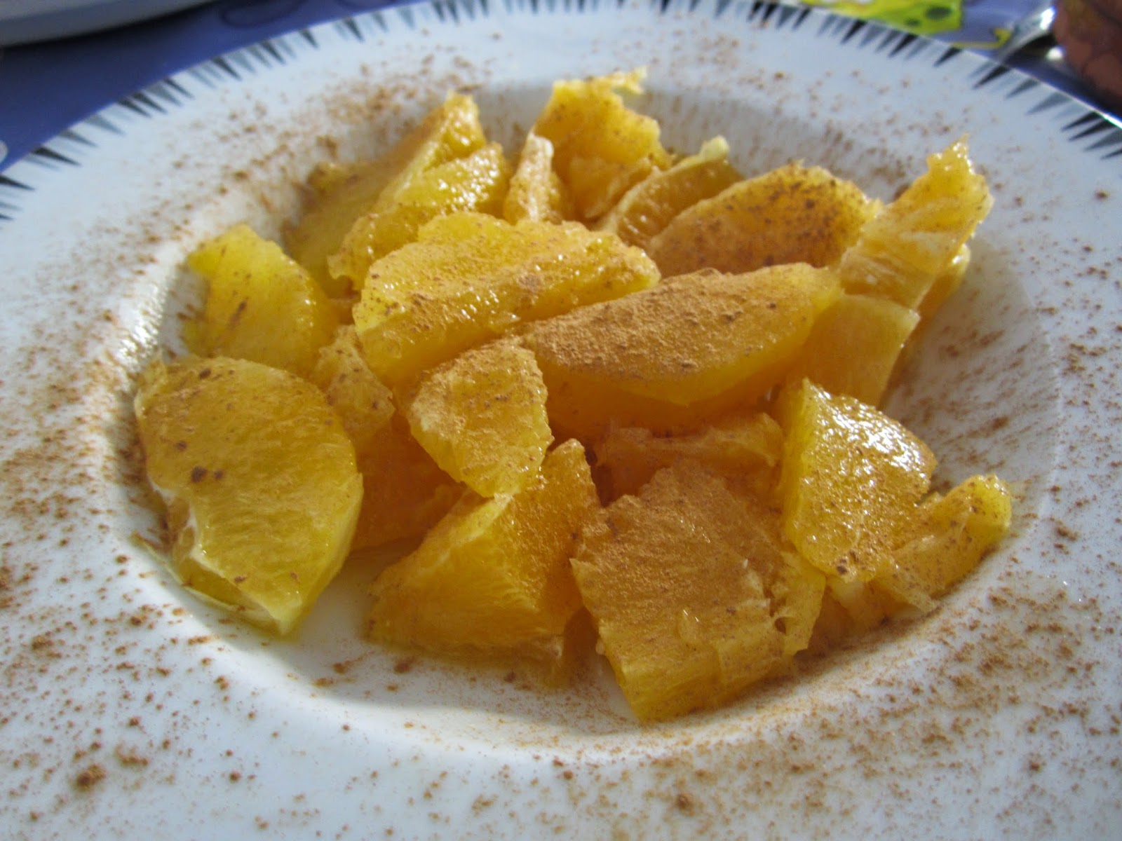 Lo primero que hemos preparado es una naranja preparada, esto es simplemente pelar bien la naranja evitando la piel blanca, trocear y espolvorear con canela.