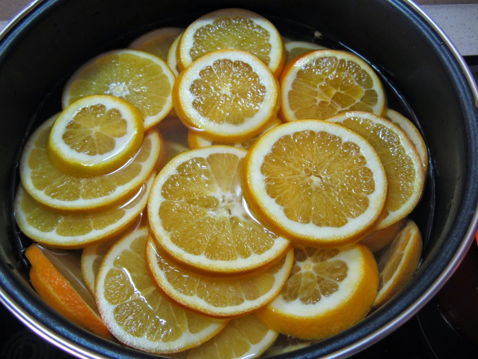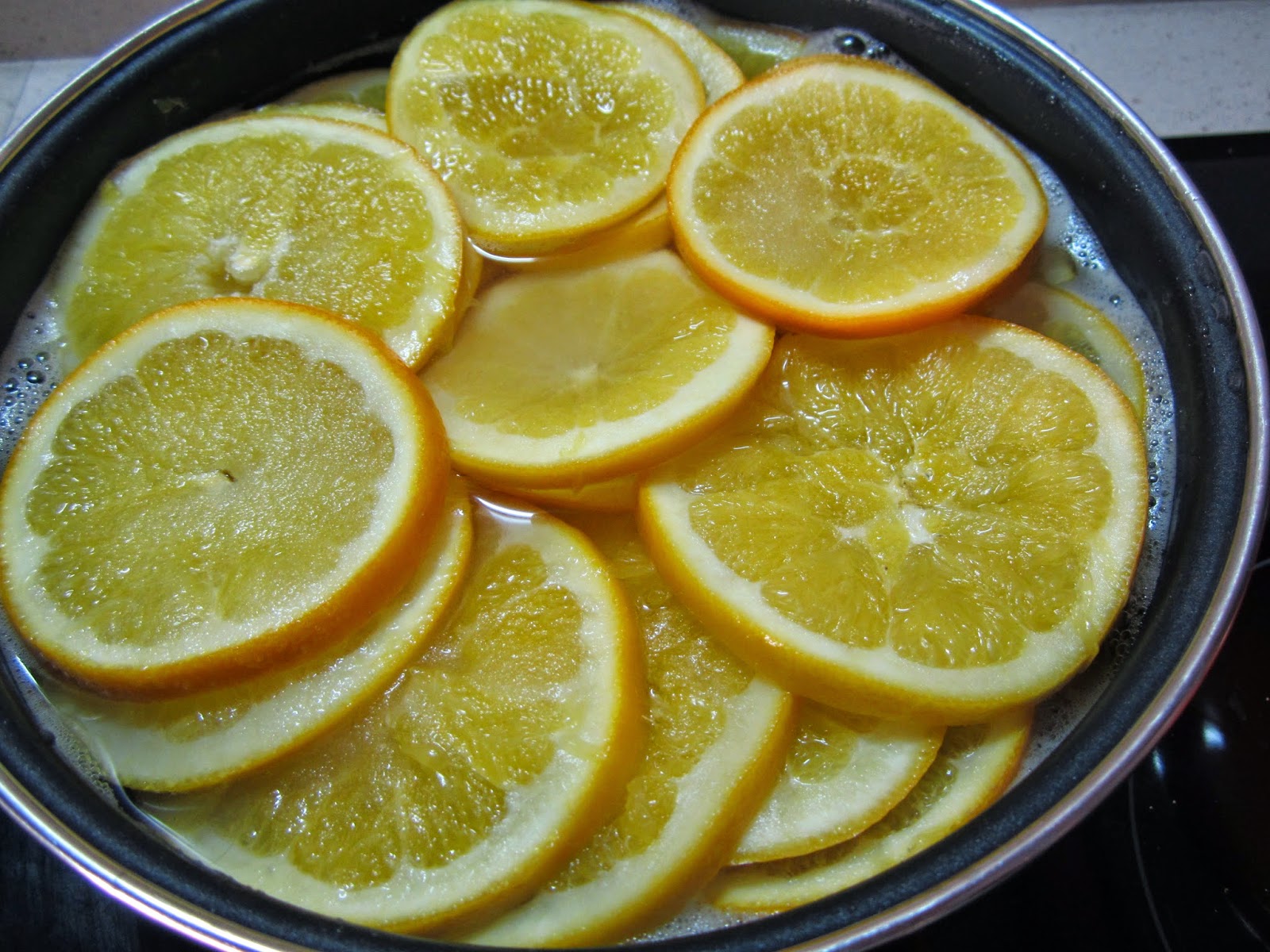 Cortamos tres naranjas a rodajas muy finas y le damos un hervor cubriendo de agua y una cucharada de bicarbonato para quitarle el amargor.