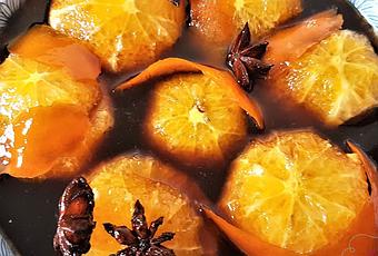 Poner el cazo el agua, el azúcar, la piel de la naranja y el anís estrellado, cocer hasta que reduzca un poco, dejar enfriar.