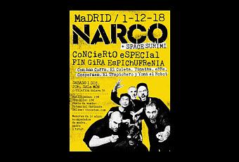 Narco estará actuando en Madrid junto a Space Surimi para despedir su actual gira por todo lo alto con muchos amigos en el escenario. La gira Espichufrenia es una gira donde Narco han vivido grandes momentos y ahora llega el momento de despedir su gira en Madrid.Narco contará con Ana Curra, El Coleta, eRRe, Tinatha, Coopermen, El trapichero y Yoni el Robot como invitados junto a Space Surimi como banda invitada. La noche del 1/12 en la Sala MON de Madrd será especial; Ahora toca despedir un disco con el que han logrado consolidar un sonido en el que la electrónica, el Rock, Dark-Punk, Hip-Hop o el Drum'n'Bass dejan de ser una influencia para integrarse definitivamente en la esencia de la banda.