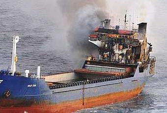 Densas columnas de humo se elevaron rápidamente desde el puente del carguero Gold Star a los pocos minutos de que fuera sobrevolado por un helicóptero de la guardia costera italiana.
