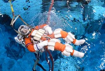 Vistiendo una versión modificada de los trajes espaciales naranjas usados en los lanzamientos y entrada a la tierra, se sumergieron en el Laboratorio de Flotación Neutral, en el Centro Espacial Johnson de la NASA, una piscina de 40 m de profundidad que ayuda a proporcionar la falta de gravedad necesaria para los astronautas en la práctica de caminatas espaciales.