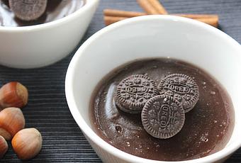 En vaso de batidora ponemos la leche y las galletas troceadas un poco, batimos a máxima potencia dos minutos, agregamos la nutella y batimos un minuto más. Incorporamos el resto de ingredientes y seguimos batiendo hasta conseguir una mezcla homogénea. Pasamos a un cuenco y llevamos a ebullición, bajamos a fuego medio y dejamos cocinarse unos 15 minutos, removiendo de vez en cuando para que no se pegue. Apartamos en cuencos y copas individuales y dejamos enfriar a temperatura ambiente, decoramos con galletas minioreos.