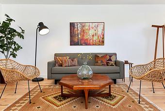 Un salón ecléctico cargado de elementos naturales y textiles de tipo kilim nos ha enamorado. Contrastre de elementos que con una combinación en armonía se asemejan a la naturaleza, predominando los colores verdes, marrones y ocres que representan a la perfección este salón, en el que podemos soñar con un bosque repleto de árboles. Nos gusta, sin dudarlo ni un momento, el magnetismo que se ha logrado en esta estancia, en la que salón y cocina se unen conformando una unidad dificilmente diferenciable. desiretoinspire ¿Qué os parece la idea de amueblar y decorar simulando la naturaleza? ¿A vosotros también os da la sensación de estar en mitad de la selva?