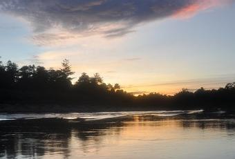 Ya vimos el río por la noche, cuando los animales duermen y los nocturnos salen a buscar comida. También hemos visto el río al amanecer cuando los animales se despiertan y bajan al río a beber y a refrescarse para pasar el día. Nos faltaba el río al atardecer, cuando el sol empieza a caer y los animales vuelven a acercarse para beber tras las calurosas horas del día en la selva.