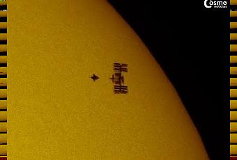 "Fue un tránsito solar del transbordador Atlantis y la EEI", dice Legault, quien viajó desde Francia para presenciar el evento. "La hora fue 13:28 UT, unos 50 minutos antes de atracar. Atlantis acababa de comenzar las maniobras de acercamiento, dando una vuelta hacia atrás que expone el escudo térmico del transbordador para que la tripulación de la EEI lo inspeccione".