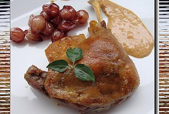 En una cazuela calentaremos el azúcar con el vino tinto y dejaremos que caramelice. Echaremos entonces las cebolletas, la soja y dejaremos que reduzca. Mientras quitaremos la grasa del confit y hornearemos a 250º (ya sabeis horno siempre precalentado) unos 20 minutos. Montaremos las claras a punto de nieve. Trituraremos el turrón y lo uniremos a las claras montadas. Presentaremos poniendo al lado del confit la mousse de turrón y las cebollitas caramelizadas. Un dulce-salado que no os debeis de perder.
