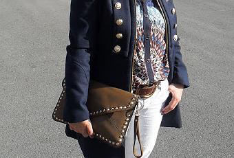 Me encanta el binomio azul marino y blanco, así que lo combiné con esta camisa étnica en tonos marino y marrón y jeans blancos.