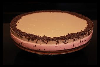 Realizamos la segunda capa, la rosa, echamos en el queso crema el colorante y damos varias vueltas hasta que esté teñido. Deshacemos la cuajada en un poco de leche para que así nuestra tarta no tenga grumos. Echamos todos los ingredientes en un cazo y cuando empiece a hervir, lo retiramos del fuego y lo echamos encima de la capa anterior que ya estará dura. Dejamos que pase dos horas en la nevera y nos ponemos con la tercera capa.Deshacemos el tercer sobre de cuajada, echamos todos los ingredientes en un cazo y cuando empiece a hervir, retiramos y lo ponemos encima de las otras dos capas. Lo dejamos en la nevera hasta el día siguiente. Antes de desmoldar adornamos con fideos de chocolate y ya está lista para servir.