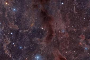 La imagen muestra los filamentos que se encuentran en el cielo entre el cúmulo estelar de las Pléyades y la nebulosa California. Este polvo no es conocido por su resplandor sino por su absorción y opacidad. Se ven varias estrellas brillantes con su luz azul que se refleja del polvo marrón. También hay otras estrellas inusualmente rojas a medida que su luz llega a su máximo a través de un pilar de polvo oscuro, con el color rojo que queda después de que el azul se haya dispersado. Otras estrellas no se ven porque están detrás de gruesos pilares de polvo. Aunque parece serena, la escena es en realidad un bucle continuo de tumulto y renacimiento. Los nudos de gas y de polvo suficientemente masivos colapsarán gravitatoriamente para formar nuevas estrellas que crearán nueva polvo en sus atmósferas y destruirán el polvo antigua con su energética luz y sus vientos.