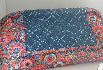Como veis combiné un trocito de tela bordada en sashiko con una preciosa tela japo en azules y rojos. Para asentar costura y acolchar un poco empleé una puntada decorativa de mi nueva máquina de coser.