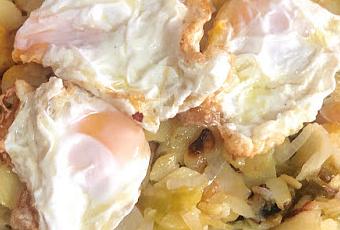 Y les eché encima unos huevos fritos, que creo que es la primera vez que me salen con "puntilla", y serán una "delicatessen" esto de "huevos fritos con puntilla", pero a mí la puntilla no me gusta nada de nada...