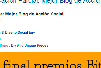 aparece en la 3ª posición como Mejor Blog de Acción Social. Además de llevarse una cámara, que me hace bastante falta, los ganadores también tendrán oportunidades laborales y eso es muy importante para mi.Mi sueño es dedicarme a esto profesionalmente, POR FAVOR PODÉIS AYUDARME A CONSEGUIRLO? Cómo? Votándome y pidiendo a la gente que tengáis alrededor que me vote.