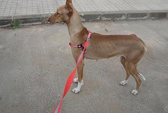 Soy un amor, dulce, tendré sobre el añito y medio, de talla mediana - grande, aunque peso solamente 15 kg por mi extrema delgadez. En casa solo quiero estar tranquilita y cuidada, en la calle me porto genial y voy tranquilamente con mi arnés y la correita. Soy una mimosa y una perrita muy fiel. Cuando vienen a verme y a acariciarme me pongo muy contenta y muevo mi esquelético rabito. Solo deseo afecto y calor humano.