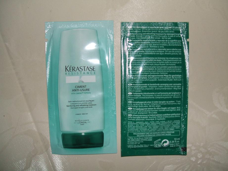De la marca Kérastase he probado el Ciment Anti-Usure, se trata de un acondicionador con aclarado que repara los cabellos largos y las puntas estropeadas. Da fuerza y cuerpo y evita que se encrespe el cabello. Con una poquita cantidad es más que suficiente. Cómo sabréis me gustan los acondicionadores sin aclarado, porque son más rápidos, jejejeje. Pero éste me ha gustado bastante, deja el pelo muy suave, fácil de desenredar, hidratado y con menos electricidad estática, aunque con solo una muestra no os puedo decir mejores resultados. Me ha impresionado mucho el efecto y el brillo que aporta al cabello.