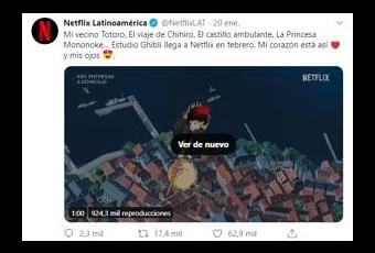 La famosa plataforma de Streaming publicó en Twitter la novedad junto a un video con extractos de las películas de Ghibli, recibiendo, como es de esperarse, ya más de 17 mil retuiteos y 62 mil «me gusta».