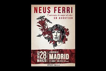 El directo de Neus Ferri en Madrid será en acústico y será dentro de unos días con la excusa de presentar su gran disco.Si hablamos de Neus Ferri; hablamos de uno de los nombres propios de la escena musical emergente y de la escena nacional.Neus Ferri actualmente presenta Canciones de amor al odio; un disco de 11 canciones editado por Maldito Records que se presentará en acústico en Libertad 8 el 28/3, una noche en la que habrá lugar para algunas propuestas del pasado y presente.