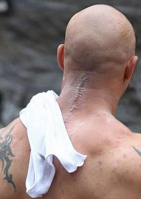 En primera instancia os traemos la foto del "cachas" Bane con una pedazo cicatriz que atraviesa verticalmente el cuello, y que según los más entendidos, es dónde se bombearía el veneno, en forma de esteroides, de aquí, su fuerza descomunal. Veremos.....