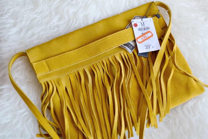 · Chollazo de última hora en las Rebajas de Bershka: cartera de mano en serraje mostaza con asa incluida y maxi flecos por menos de 5 € cuando su precio real era de casi 40€. Le veo muchas posibilidades en verano.