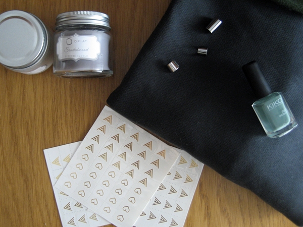 En KIKO me compré un pintauñas en un tono verde grisaceo por 1.90€. Y en la tienda MANGO unas pack de pulseras-braceletes dorados, por unos 2-3€ aproximadamente.