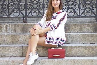 In the most famous and frequented stores where we all use to but there are some pieces that are emerging as ‘musts’ in our closets and I could say that one on those would be this shirt/jacket with ethnic embroidery. It is very easy to combine and it is perfect for these months of halftime. Today I chose a t-shirt with a message, something that I like, this time winking at my lovely city, LA. Below I wear a pair of denim shorts to break the touch more lady of the jacket and I have chosen my white Stan Smith sneakers with the details in dark blue. My red bag with studs and gold chain matching the print of the jacket and the tee.