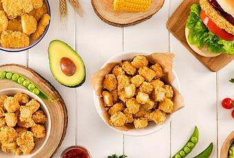 Extra Crispy Nuggets sabor pollo: jugosos nuggets con una cobertura extra crispy a base de trigo, soja y guisantes.