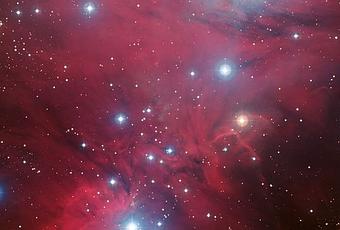NGC 2264 se halla a unos 2.600 años luz de la Tierra, en la oscura constelación de Monoceros (el Unicornio), no lejos de la popular Orión (el Cazador). La imagen muestra una zona del espacio de aproximadamente 30 años luz de extensión. William Herschel descubrió este fascinante objeto durante sus grandes mediciones del cielo a fines del siglo 18. La primera vez que detectó el brillante cúmulo fue en enero de 1784 y dos años más tarde, en Navidad, distinguió la parte más brillante de la escurridiza mancha en las nubes de gas incandescente. El cúmulo es muy brillante y puede ser visto fácilmente con binoculares. Con un telescopio pequeño las estrellas parecen luces destellantes en un árbol de Navidad. La deslumbrante estrella en parte superior es suficientemente brillante como para ser observada a simple vista. Es un sistema masivo de múltiples estrellas que sólo emergió del polvo y del gas hace pocos millones de años.