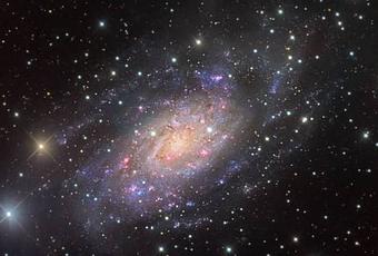 A unos 10 millones de años luz de distancia y con un diámetro de unos 50.000 años luz, esta galaxia espiral parece contener más regiones H II de formación estelar de lo habitual, indicadas por el resplandor rojizo del gas de hidrógeno atómico. Las gigantescas regiones H II son empoderadas por cúmulos de estrellas calientes y masivas que explotan como brillantes supernovas al final de sus vidas cortas y furiosas. NGC 2403, miembro del grupo de las galaxias M81, se parece mucho a la galaxia del triángulo M33, otra galaxia con numerosas regiones de formación estelar que se encuentra dentro de nuestro grupo local de galaxias. Las brillantes estrellas de aspecto puntiagudo de esta imagen de NGC 2403 se encuentran en primer plano, dentro de nuestra Vía láctea.