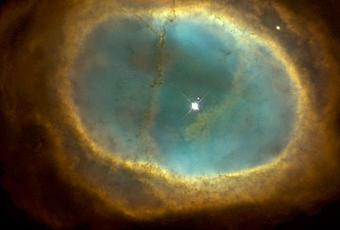 Es la estrella tenue y no la brillante, cerca del centro de NGC 3132 , la que creó esta extraña pero hermosa nebulosa planetaria . Llamada la nebulosa de los Ocho Estallidos y la nebulosa del Anillo del Sur, el gas brillante se originó en las capas externas de una estrella como el Sol. En esta fotografía de colores representativos, la balsa azul de luz que se ve alrededor de este sistema binario recibe la energía de la superficie caliente de la estrella tenue. Aunque fotografiada para investigar simetrías inusuales, son las asimetrías las que hacen esta nebulosa planetaria tan intrigante. No se comprende muy bien ni la extraña forma de la cáscara más fría que la rodea ni la estructura y la posición de las bandas de polvo filamentosas que atraviesan NGC 3132 .