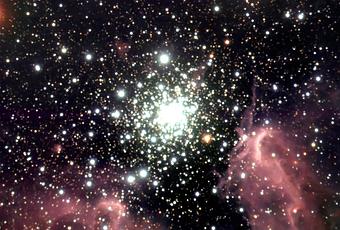 Esta imágen del cúmulo estelar NGC 3603 y su entorno, se obtuvieron en tres bandas de filtro de infrarojo cercano, con el instrumento ISAAC en el telescopio ANTU en el VLT en Paranal. NGC 3603 se encuentra en el brazo espiral de Carina de la Vía Láctea a una distancia de unos 20.000 años luz. Es el único, cúmulo galáctico de ésta región de nuestra galaxia. Su hidrógeno es ionizado en el que un grupo central está constituido por estrellas de tipo O y B que ionizan la nebulosa con radiación ultravioleta. NGC 3603 puede ser estudiado en espectro visible y longitudes de onda del infrarrojo cercano. Esto se debe a que la línea de visión está razonablemente libre de polvo en esta dirección; el estudio en la radiación del infrarrojo cercano, es para evitar la materia entre la nebulosa y nosotros. La masa total de las estrellas O y B calientes en NGC 3603 es de más de 2.000 masas solares.