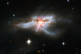 NGC 6240 ofrece una rara visión de una catástrofe cósmica en las etapas finales. La titánica colisión galaxia-galaxia tiene lugar a unos 400 millones de años luz de distancia en la constelación Ophiuchus . Las galaxias en fusión lanzan colas de marea distorsionadas de estrellas, de gas y de polvo y están sometidas a rápidos y furiosos estallidos de formación estelar. Los dos agujeros negros supermasivos que hay en los núcleos galácticos originales también se fusionarán en un único agujero negro aún más masivo; pronto sólo quedará una sola enorme galaxia. Esta espectacular imagen de la escena es una composición de datos de banda estrecha y de infrarrojo cercano y de datos de banda ancha visible procedentes de las cámaras ACS y WPC3 del Hubble. La vista abarca unos 300 mil años luz a la distancia estimada de NGC 6240 .