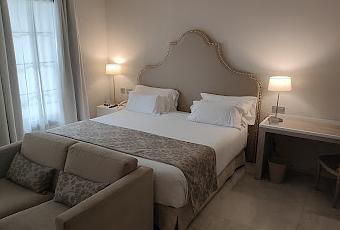 En el mismo centro de judería, pegado a la muralla y a dos pasos de la Catedral - Mezquita, en una recoleta plaza empedrada junto a la estatua de Maimónides encontramos un conjunto de edificios de tres alturas construidos en torno a varios patios típicamente andaluces encalados en blanco de configuración irregular. Una escalerita de media docena de escalones con macetas en la barandilla de forja nos deja ante dos puertas de cristal y aluminio, de las que hay que empujar. Entre medio de ambas hay una zona con un enorme logotipo de la cadena, en rojo, y alguna planta, además de una gruesa alfombra granate. La segunda puerta nos la abre un empleado que está allí al lado montando el árbol de Navidad.Accedemos así a una pequeña recepción, cuyo mostrador está al fondo, frente a nosotros. A la derecha, un patio, a la izquierda unas escaleras que bajan hacia otros patios y comunican con las habitaciones. Suelo y paredes de mármol blanco con algunas incrustaciones en salmón, seguramente fresco en verano, pero en el lluvioso y frío día en el que hemos llegado a Córdoba resulta algo desangelado. La luz lo llena todo a través de grandes ventanales a esos patios. A la izquierda del mostrador, una mesa auxiliar nos ofrece agua fresca, zumos, frutos secos y chucherías de bienvenida. El mostrador es poderoso, en mármol negro, con una pantalla sobre el mismo y una amable empleada que nos atiende eficazmente. Nos pide nuestro DNI y rápidamente nos entrega los documentos a firmar y la tarjeta que hará las veces de llave de la habitación. Nos indica que al ser platino de la cadena nos han ubicado en una habitación mejor. Nos explica los horarios del hotel y sus servicios, el camino para llegar a la habitación y las claves del wifi, que es gratuito, pero que funciona con alguna dificultad en algunas partes del hotel.Volvemos sobre nuestros pasos y bajamos otra media docena de escaleras para llegar a otro patio, más grande en el que se sirve el desayuno y que a nuestra llegada está tranquilo. Atravesamos un largo pasillo con habitaciones protegido por una mullida alfombra negra que amortigua el ruido de las maletas hasta llegar al siguiente patio, en el que encontramos la pequeña y coqueta piscina del hotel, y allí mismo tenemos nuestra habitación. Con los números metálicos anclados a una generosa puerta de madera clara.Tras ella se mantiene el suelo de mármol, paredes recubiertas de un vescom clarito casi blanco. Un pequeño pasillo bien iluminado antes de otra puerta tras la que se accede al dormitorio hace las veces de vestidor. En el lado derecho encontramos la ranura de la llave que acciona las luces, y un estrecho espejo de techo a suelo con un fino marco de madera. Todo el lado izquierdo está ocupado por tres cuerpos de armario con puertas. En el primero, una barra colgadora con una docena de perchas de distintos tipos: para vestidos, para faldas, para chaquetas, para pantalones... En el cuerpo central encontramos una bandeja con un hervidor de agua y una cafetera Nespresso así como varios juegos de café y té, tazas, copas, vasos y una botella de agua de cortesía. Por debajo, un minibar con la puerta de cristal relleno de refrescos, cervezas y algunos zumos. Encima de él algunos snacks. En el último cuerpo, varias baldas donde encontramos la caja fuerte, la bolsa de la lavandería, un calzador, una gamuza lustrazapatos y una tarjeta para solicitar la limpieza manual del calzado.