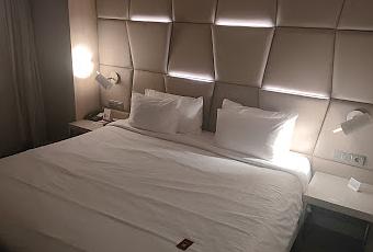 En el lado izquierdo encontramos la enorme cama blanca. Empotrada contra un cabecero retranqueado y tapizado en piel marrón clara de formas cuadrangulares, estando algunas separadas y conteniendo en su interior una tira de led que crea una agradable sensación lumínica. Dos canapés tapizaos en piel blanca sostienen un enorme colchón de gran calibre cubierto por un suave nórdico envuelto en agradables sábanas y cuatro almohadas de distinto tamaño, grosor y dureza. A cada lado sendas mesillas a juego con la mesa de trabajo: patas de metal y mesa de madera lacada en claro. Sobre una de ellas un teléfono negro moderno, un bloc de notas y un bolígrafo, el mando de la televisión y un folleto de información del hotel. Sobre ambas, interruptores para la luz, y enchufes disponibles. Además empotrados al cabecero hay sendos flexos de luz en plástico blanco y madera dirigibles, con suficiente potencia para la lectura o el trabajo desde la cama. Aunque la insonorización exterior es estupenda, la interior podría mejorar, especialmente en lo que respecta a voces y ruidos en el pasillo.