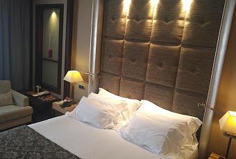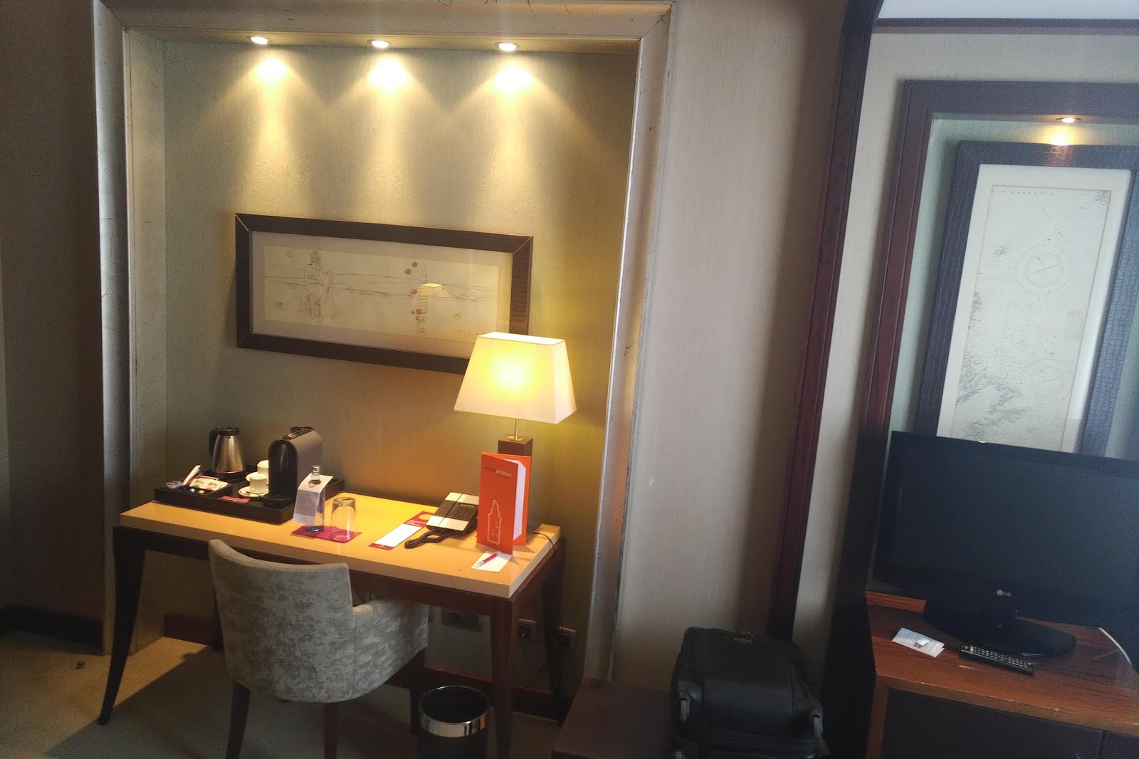 Dos puertas de cristal automáticas con el logo en dorado de la cadena nos dejan en la recepción. Demasiado llena y bulliciosa en ese momento. Hay un partido de fútbol y alguno de los equipos está allí alojado, con el correspondiente follón de aficionados e hinchas. El empedrado adoquinado de la calle pasa en el interior a mármol en tono crudo. A la derecha hay una zona con un sofá doble que reposa sobre una tupida alfombra. A continuación encontramos cuatro escaleras que nos bajan hasta la recepción propiamente dicha. En el salto de las escaleras se ha puesto, a la derecha, una zona con bebidas de bienvenida, aunque no queda nada de beber. A la izquierda, hay otra zona con butacas, llenas de gente y unas escaleras con una barandilla dorada que suben a una entreplanta en la que hay salas de reuniones.A la derecha quedan los mostradores de recepción. Dos. Poderosos, de madera rojiza. Separados entre si por una lámpara con una pantalla de cristal. Aunque hay dos puestos habilitados, sólo hay un recepcionista y un montón de gente alrededor del mostrador. Pronto llega otro empleado que nos pide disculpas por la espera y se esfuerza en darnos lo más rápidamente posible la habitación. Nos pide el número del DNI que confirma en la reserva, nos entrega la llave de la habitación, y nos explica el funcionamiento del wifi y los horarios de los servicios del hotel. Le decimos que no podremos desayunar porque saldremos muy temprano y nos indica que desde las 5 hay un desayuno de madrugadores para que no nos vayamos en ayunas. El proceso se hace rápido y cordial.