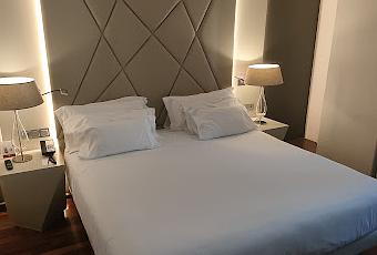Las puertas de las habitaciones son enormes, de madera oscura algo envejecida, con el número en metal sobre las mismas, con una moderna cerradura de acercar la tarjeta y un poderoso tirador en metal oscuro también envejecido. La puerta casi se abre al dormitorio, que queda allí mismo, a la izquierda. Suelo de madera brillante, en algunos puntos ya rayada y algo desgastada. Junto a la puerta, una ranura para meter la tarjeta y dos interruptores al lado. Encima, el display del aire acondicionado, que funciona muy silenciosa y eficazmente con una rueda para establecer la temperatura en la gran pantalla digital, y dos botones (uno para encenderlo y apagarlo y otro para subir y bajar la potencia). Detrás de la puerta queda el armario empotrado tras dos puertas correderas de espejo. En un lado, un colgador con media docena de perchas antirrobo de madera oscura con el logotipo de la cadena, y un par de perchas acolchadas en seda roja. En el suelo, una caja fuerte. En el otro lado hay varias baldas. En una de ellas encontramos la ropa de la lavandería, un calzador y una gamuza limpia zapatos... Frente a la puerta de entrada queda la puerta del baño, también en madera envejecida y con un pomo redondeado de metal también envejecido. Hacia la izquierda se abre el dormitorio. De tamaño correcto destaca sobre todo por la enorme cama blanca que se empotra contra un cabecero de piel a modo de capitoné de formas rectangulares y color gris verdoso. Este dispone de una luz retranqueada que ofrece un bonito y agradable escenario lumínico. Sobre el canapé descansa un enorme y comodísimo colchón de gran calibre y seis almohadas de distinto tamaño, grosor y dureza. Un suave nórdico blanco lo recubre. A cada lado sendas mesillas potentes en madera, de forma irregular a juego con el cabecero. Sobre ellas, lámparas de noche con pie de cristal en forma de vasija y tulipa de tela en marrón oscuro. Clavados al cabecero dos potentes flexos direccionables para la lectura o el trabajo en la cama. En una mesilla un moderno teléfono, el mando a distancia de la televisión, un bloc de notas y un bolígrafo y sobre las dos, enchufes disponibles e interruptores para todas las luces de la habitación.