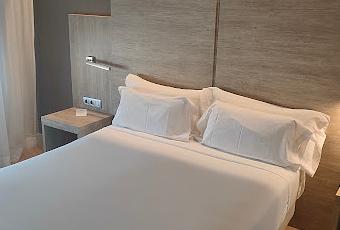 La pared del fondo, cubierta por completo por un visillo blanco de lado a lado y de techo a suelo, recoge una moderna ventana con persiana en aluminio gris. Las vistas, a un enorme patio ajardinado con varias piscinas aquí, y a las torres de Madrid allá, permiten, además, llenar el dormitorio de luz. Pese a que la ventana es relativamente nueva, no cierra bien en la parte de abajo, lo que hace que el viento y el frío se cuelen un poco hasta que bajamos la persiana del todo, consiguiendo así la oscuridad absoluta de la habitación.En el lado derecho se encuentra la cama. Un somier blanco sostiene un buen colchón de generoso calibre muy confortable. Vestida con un suave y ligero edredón nórdico es grande para ser individual y algo justa para ser doble. Cuatro almohadas de distinta dureza y grosor. Empotrada contra un cabecero de madera de tres cuerpos. A cada lado, sendas mesillas de madera a juego. Sobre una de ellas, un teléfono moderno y el mando de la televisión. Sobre ambas enchufes disponibles, interruptores y un par de enchufes de USB. Anclados al cabecero sendos brazos metálicos de iluminación que generan un ambiente acogedor. En la parte superior de la cama, por un retranqueo de la escayola del techo, corre una tira de led que da mucha luz a la estancia, aunque quizá algo fría. El descanso es bastante agradable, porque el hotel es tranquilo. Gracias a la orientación interior de la habitación y a la persiana, la insonorización exterior es adecuada. Sin embargo la insonorización interior es brutalmente mejorable. Se escuchan todos los sonidos de las habitaciones contiguas.