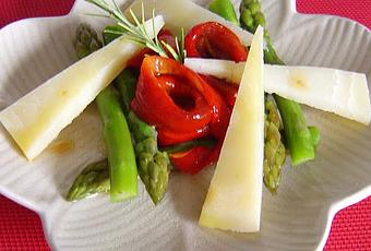 Cortar el queso en pequeños triángulos.Para emplatar, colocar los espárragos, enmedio los pimientos, alrededor el queso y rociar con aceite de oliva.