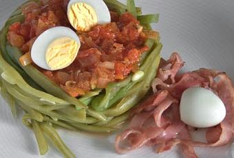 de úlcera de estómago. Ingredientes para cuatro personas 600 gr de judías verdes 600 gr de tomates maduros Una cebolla mediana 8 huevos de codorniz 4 lonchas de panceta ahumada Una cucharada de estragón Un diente de ajo Sal Pimienta Aceite de oliva