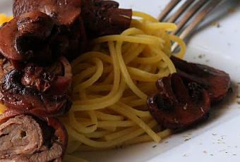 En cuanto el vino comienza a hervir dejamos que el alcohol se evapore un poco y apagamos el fuego. Recuerden que la carne es delgada y se cocina rápido. El acompañante ideal para este plato es una pasta al oleo con un toque de ajo rayado. Lo puedes presentar entero o rebanado con en la foto de la portada. Buen provecho!