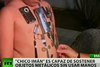 En Brasil vive un niño muy especial: su cuerpo funciona como un verdadero magneto. Su abdomen, espalda y pecho atraen objetos metálicos que quedan pegados a su piel.Paulo David Amorim, del estado Rio Grande do Norte, puede llevar cucharas, tijeras e incluso cazuelas pegados a su cuerpo. Durante una entrevista con el canal brasileño TV Globo, el padre del chico contó que un día pidió a su hijo que le trajera un cuchillo y un tenedor "¡y fue una sorpresa para mí que se le engancharon!".