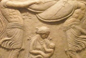 (31-14 a.C.) Los Curetes, con el sonido de sus escudos, intentan ocultar el llanto del recien nacido Zeus, que está en brazos de la ninfa Amaltea.