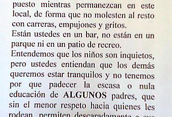 Estamos hablando de condiciones normales de una familia que se va a tomar un café o un refresco o caña con niños. No me refiero a soltar a los niños y que hagan lo que quieran y molesten al resto....que también hay casos...que no sabes donde están los padres y los niños están corriendo y chillando por el local...
