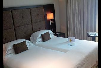 Maite en recepción nos atiende con la misma rapidez y eficacia que simpatía. Nos pide los DNIs mientras nos pregunta por el viaje y nos explica algunos servicios y horarios del hotel. Mientras, un compañero, que sonríe, fotocopia los documentos y un camarero, que también sonríe, nos sirve dos copas de cava. Enseguida nos entregan las llaves mientras terminan de explicarnos todas las opciones del hotel y cómo funciona su wifi... Atravesando ese elegante hall que al final hace las veces de cafetería llegamos a los ascensores. Hay dos. Uno más grande que el otro que resulta algo estrecho. Bien iluminados, recubiertos de espejos y con algunos carteles de los servicios del hotel por plantas.