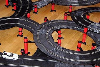 Y para terminar el circuito rally de rallies con un antología de tramos irregulares seleccionados de mis diseños de circuitos de rally.El circuito tiene dimensiones 2,88 x 2,28 y una cuerda prácticamente compensada de 22,60 metros.Esta diseñado con una combinación de pistas Ninco y scalextric usando cuatro pistas de adaptación.