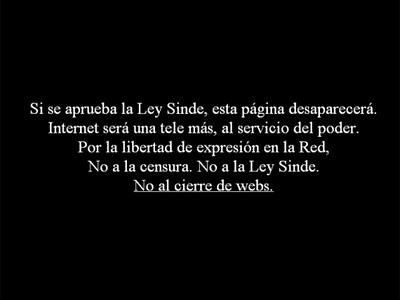 Este es el mensaje que apareció estos últimos días al intentar acceder a la mayoría de páginas y sitios de descargas en Internet en protesta por la inminente aprobación de la llamada 'Ley Sinde'. El motivo concreto de esta protesta, centralizada en la página “No al cierre de webs” es la decisión del Congreso de aprobar la 'Ley Sinde' en una única reunión de la Comisión de Economía que se celebrará hoy, martes, día 21, que permite aprobar la ley en su conjunto sin discutir ninguna enmienda, ni el articulado de la ley, y sin pasar por el pleno del Congreso.